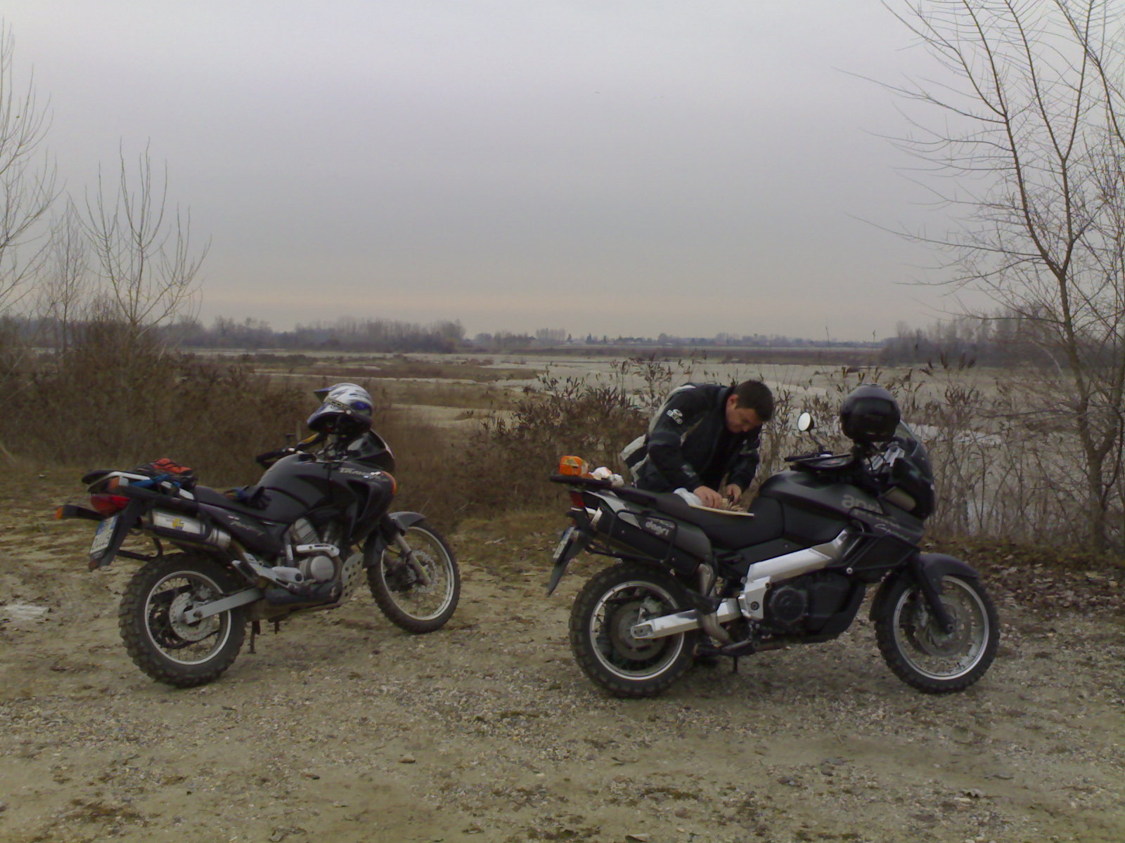 Il 22, il giorno prima, la mia splendida moto ha compiuto i primi due anni nelle mie mani. Per l'occasione ho dunque chiamata il buon Nelly che mi ha accompagnato a festeggiare la motoretta! Siamo partiti da Pozzo lungo la camionabile, nella quale abbiamo toccato i 120/130 km/h. Poi alla fine, dopo una deviazione sull'argine, siamo ridiscesi nel letto e ci siamo divertiti sul ghiaione del fiume. Io ho rischiato di fare un bel volo quando a circa 60 km/h ho preso una zolla di sabbia oltre la quale c'era una buca. Siamo riusciti vicino a Morsano, ci siamo ributtati dentro poco dopo ma abbiamo trovato un'ansa del fiume che ci ha sbarrato la strada. Peccato, era una splendida zona sabbiosa con alcune dune. Devo ammettere che l'inverno il ghiaione del Tagliamento è più fattibile, forse perché più compatto o forse per il ghiaccio; ne abbiamo infatti trovato un bel po'. A questo punto siamo ripartiti e, trovato un bel posto con visto panoramica sul fiume, ci siamo sparati un ottimo panino con salame di Coderno, parlottando con un cacciatore coi suoi cani. Quindi siamo ripartiti e siamo andati a cercare un'altra stradina, ma il ghiaccio e il fango ci hanno fatto desistere, anche perché eravamo stanchi, ed è a questo punto che Enrico è impazzito! Dopo aver cercato di ammazzarmi però si è ricalmato, siamo ripartiti, qualche stradina bianca, e chiusura a mangiare panini e bere birra in Stazione! Che bella giornata, fredda ed avventurosa!